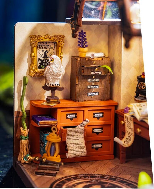 The Magic Study van Robotime is een houten bouwwerk die je vanaf 14 jaar kunt bouwen. Dit bouwwerk stelt een heksenwinkel voor die helemaal vol is met heksenspullen en boeken. Ook heeft de winkel een mooie authentieke koepel dit alles bijelkaar geeft het echt een magische sfeer aan het geheel.