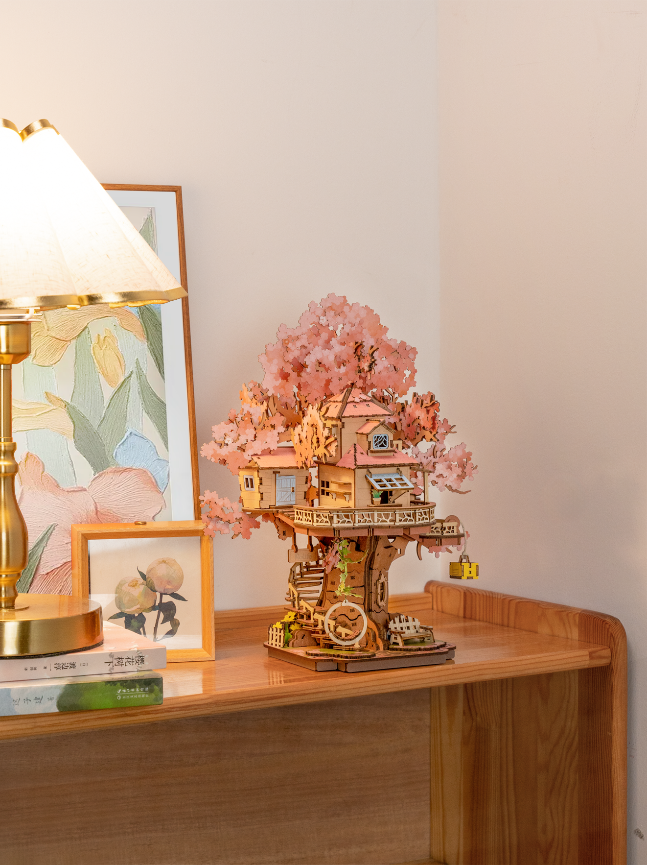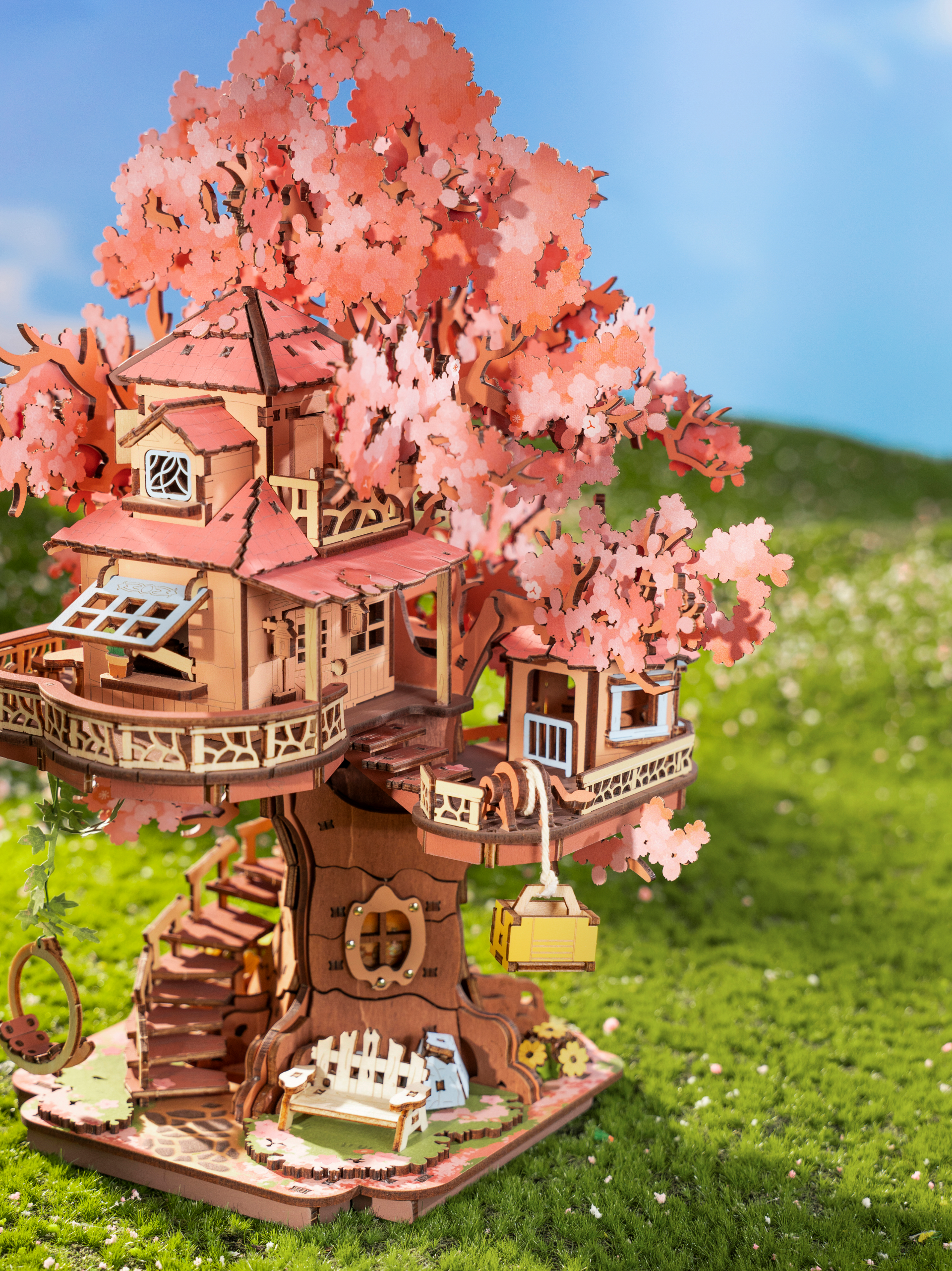 De houten puzzel stelt een boom voor vol in kersenbloesem waarin een boomhut verscholen zit. Deze hut bestaat uit meerdere kamers waar vanalles te ontdekken valt, van een echte wenteltrap tot een echt werkende goederenlift.