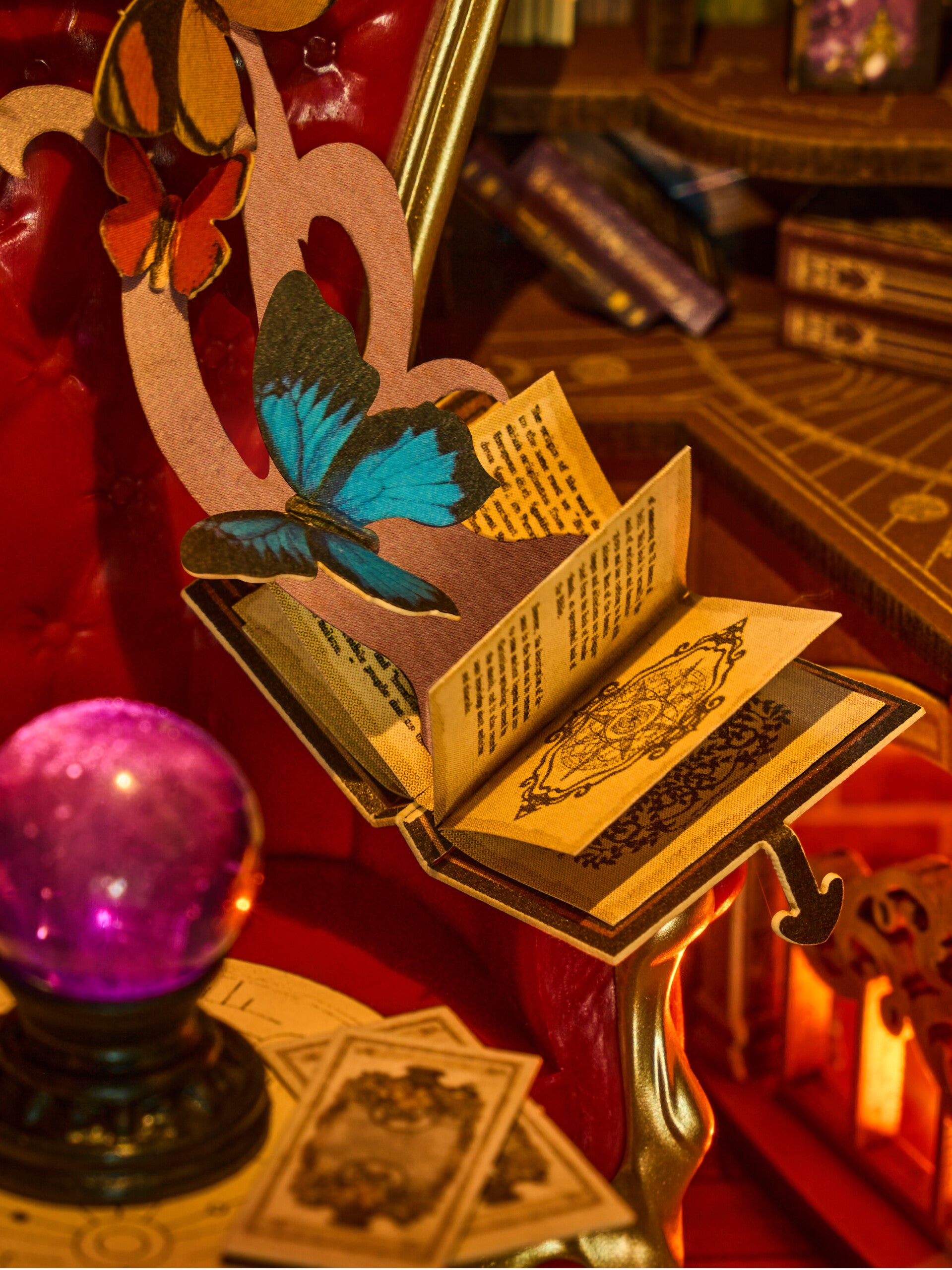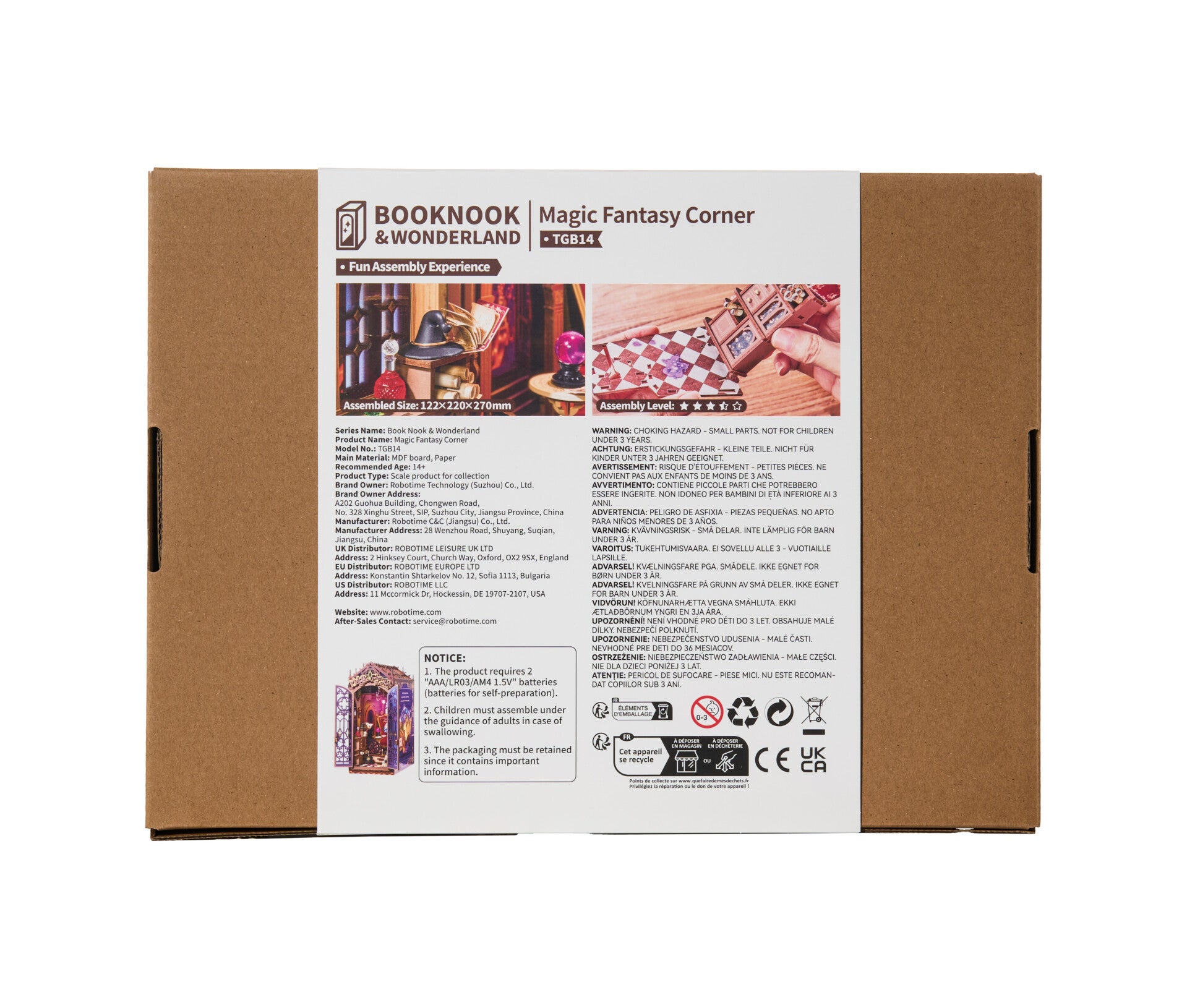 De Book Nook Fantasy Corner is een houten bouwpakket geschikt voor bouwers vanaf 14 jaar en ouder. Deze houten bouwpakket neemt de bouwer mee in een fantasiewereld vol met magie, samen met de rode fauteuil en een zwarte kat geven deze Book Nook een fantasierijke voorstelling. De kleine deurtjes in het Book Nook activeren de led-verlichting die de gehele voorstelling gezellig verlichten.