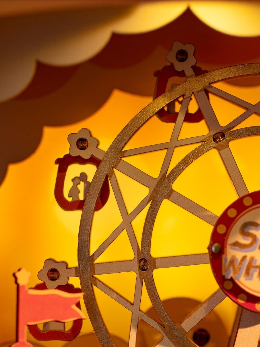 De Sunset Carnival is een houten bouwpakket voor iedere bouwer vanaf 14 jaar en ouder. Dit model is een vintage televisie op pootjes compleet met een antenne. Je ziet een tv-programma over een pretpark tijdens zonsondergang. Het reuzenrad voegt een vleugje romantiek toe, omdat een stelletje kusjes geven. Ook zijn er schattige details zoals een konijn met een trompet en een beer op een fiets.