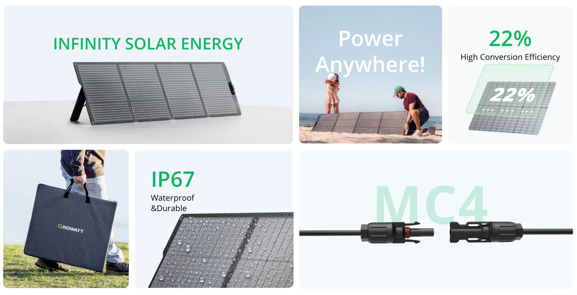 Het Growatt 200 Wp zonnepaneel is de perfecte aanvulling voor de Growatt Infinity 1300, 1500 en 2000 (Pro) powerstations. Dankzij het monokristallijne design met 22 % efficiëntie levert dit compacte, opvouwbare paneel betrouwbare zonne-energie, waar je ook bent. Met de geïntegreerde MC4-aansluitingen sluit je het paneel eenvoudig aan op jouw Infinity powerstation en laad je off-grid met maximaal rendement.