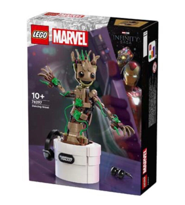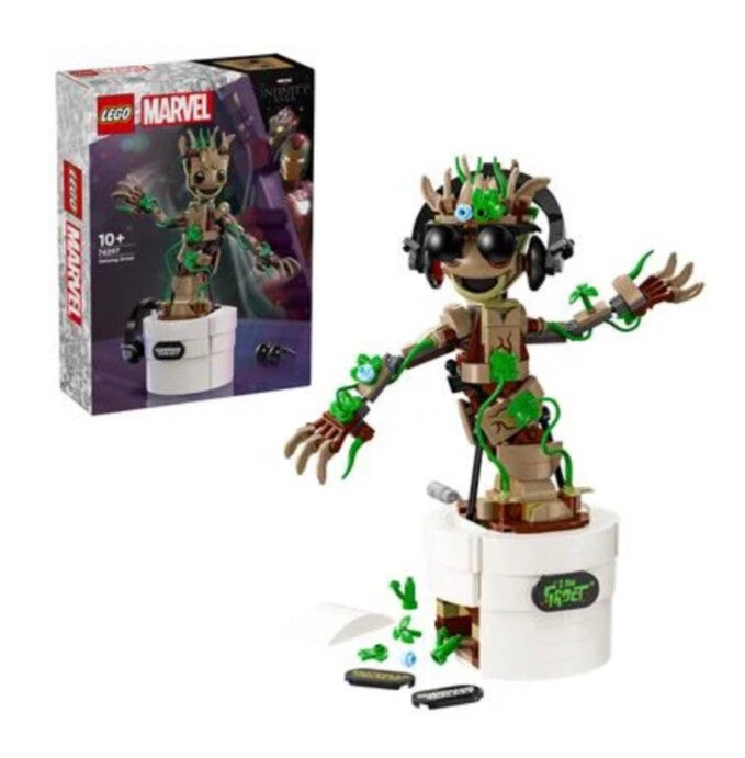 LEGO Marvel Dansende Groot (76297) is bouwbaar Guardians of the Galaxy speelgoed met een interactieve dansfunctie. Dit is een geweldig cadeau voor kinderen vanaf 10 jaar die fan zijn van het Marvel personage Groot, superhelden en bouwbaar LEGO speelgoed. Dit speelgoedmodel van Groot heeft een beweegbaar hoofd en verstelbare armen. Als kinderen aan de hendel aan de achterkant van de bloempot draaien, begint Groot te dansen. De figuur kan worden aangepast met extra bladeren, een bouwbare koptelefoon en zonnebril. Bovendien kunnen kinderen de plantenpot personaliseren door 1 van de 3 verschillende naamplaatjes aan de voorkant toe te voegen (waaronder één die verwijst naar de tv-serie I am Groot). Al deze accessoires kunnen worden opgeborgen in het ingebouwde vak van de pot. Om het bouwen van het model nog leuker te maken, kunnen kinderen met de LEGO Builder app inzoomen, het model in 3D draaien en hun voortgang bijhouden. 459-delig. Geschikt vanaf 10 jaar.