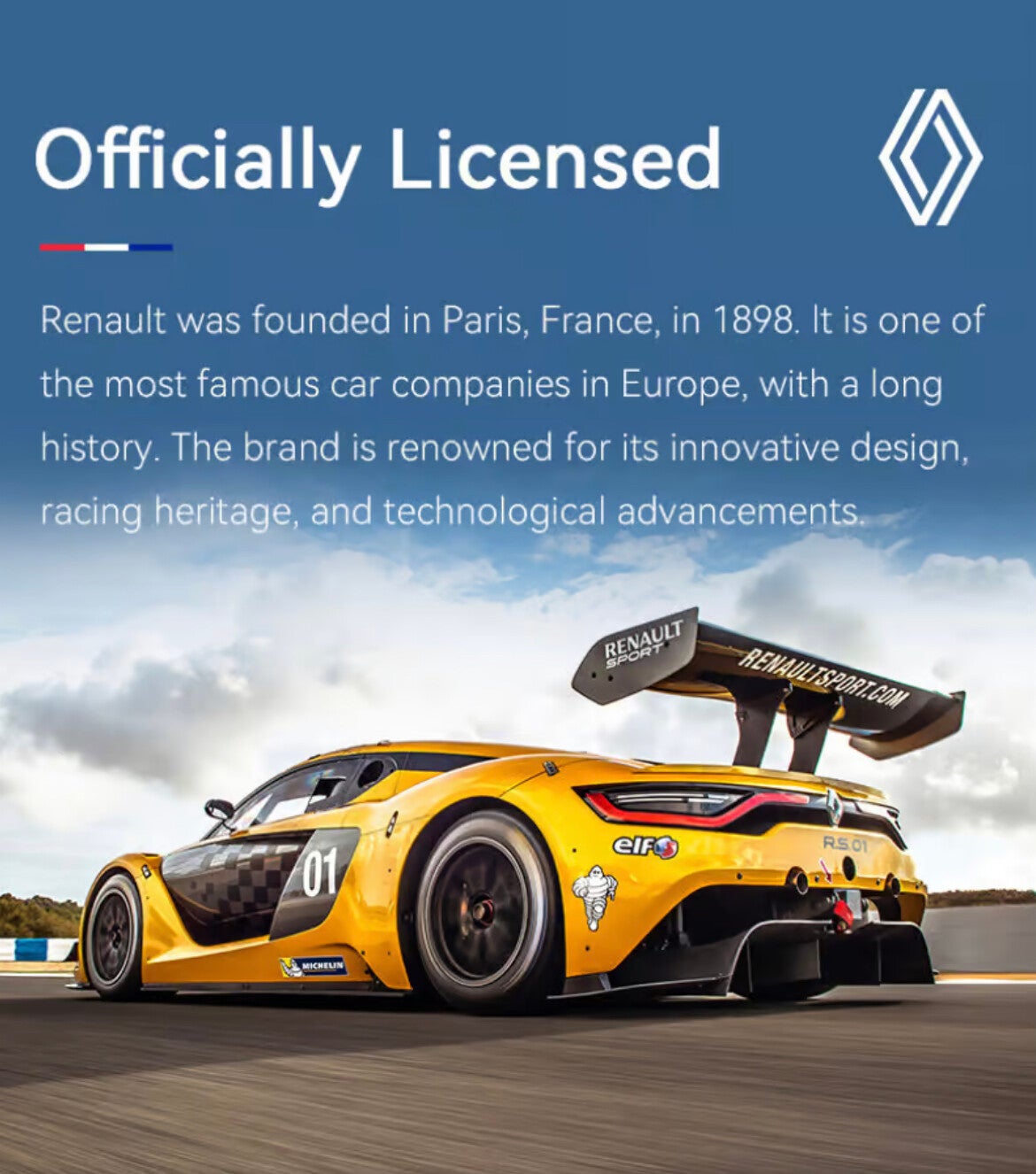 Geïnspireerd op de spectaculaire Renault Sport RS.01, straalt dit model pure snelheid en aerodynamische perfectie uit. De lage, brede carrosserie, agressieve luchtinlaten en grote achterspoiler maken deze racewagen tot een echte blikvanger – zowel op je display als op de vloer.